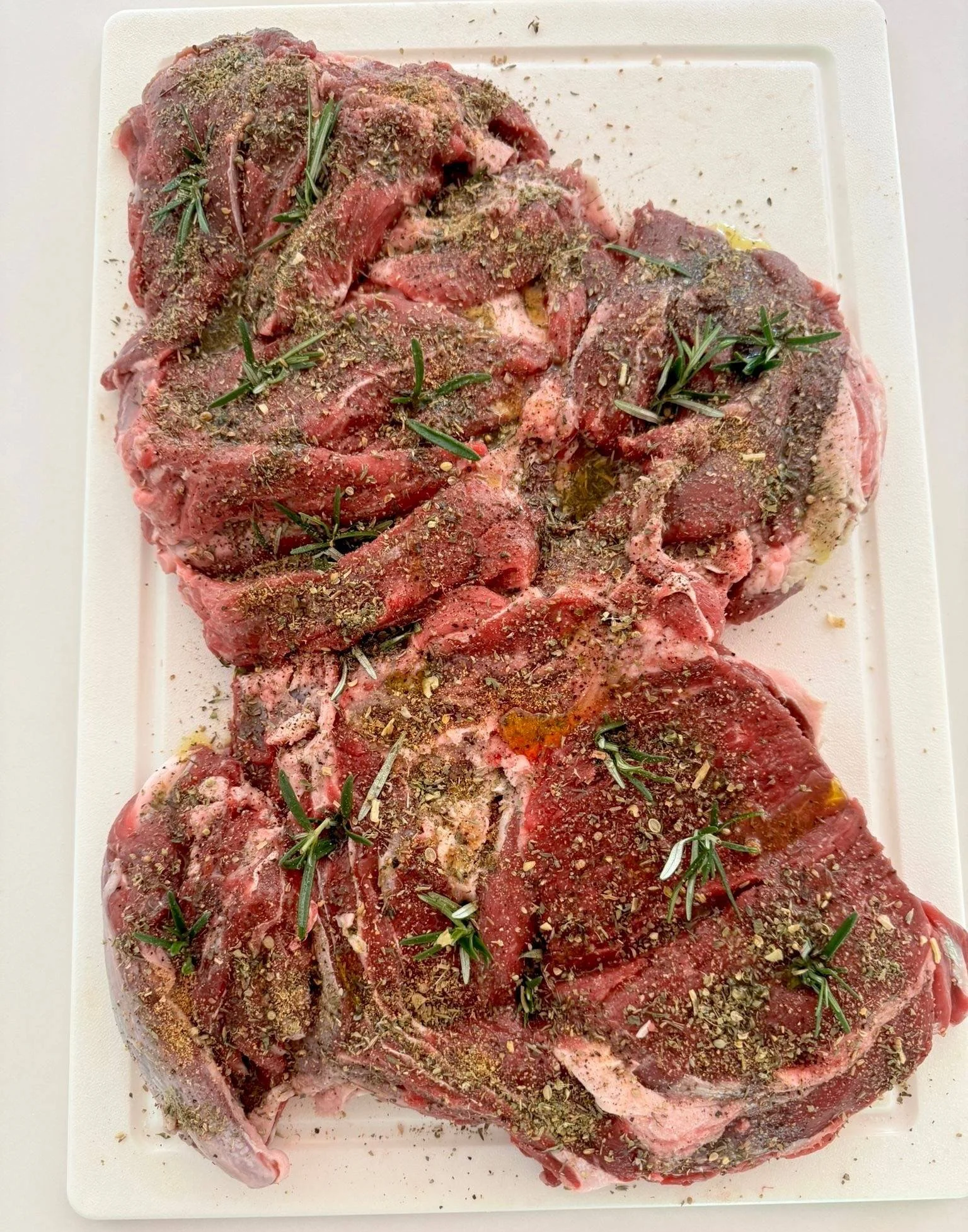 In terms of seasoning, I’m a traditionalist. I stud the meat with slivers of garlic and coat it with salt, pepper and fresh rosemary. This past weekend, I added some garlic powder to the dry rub.