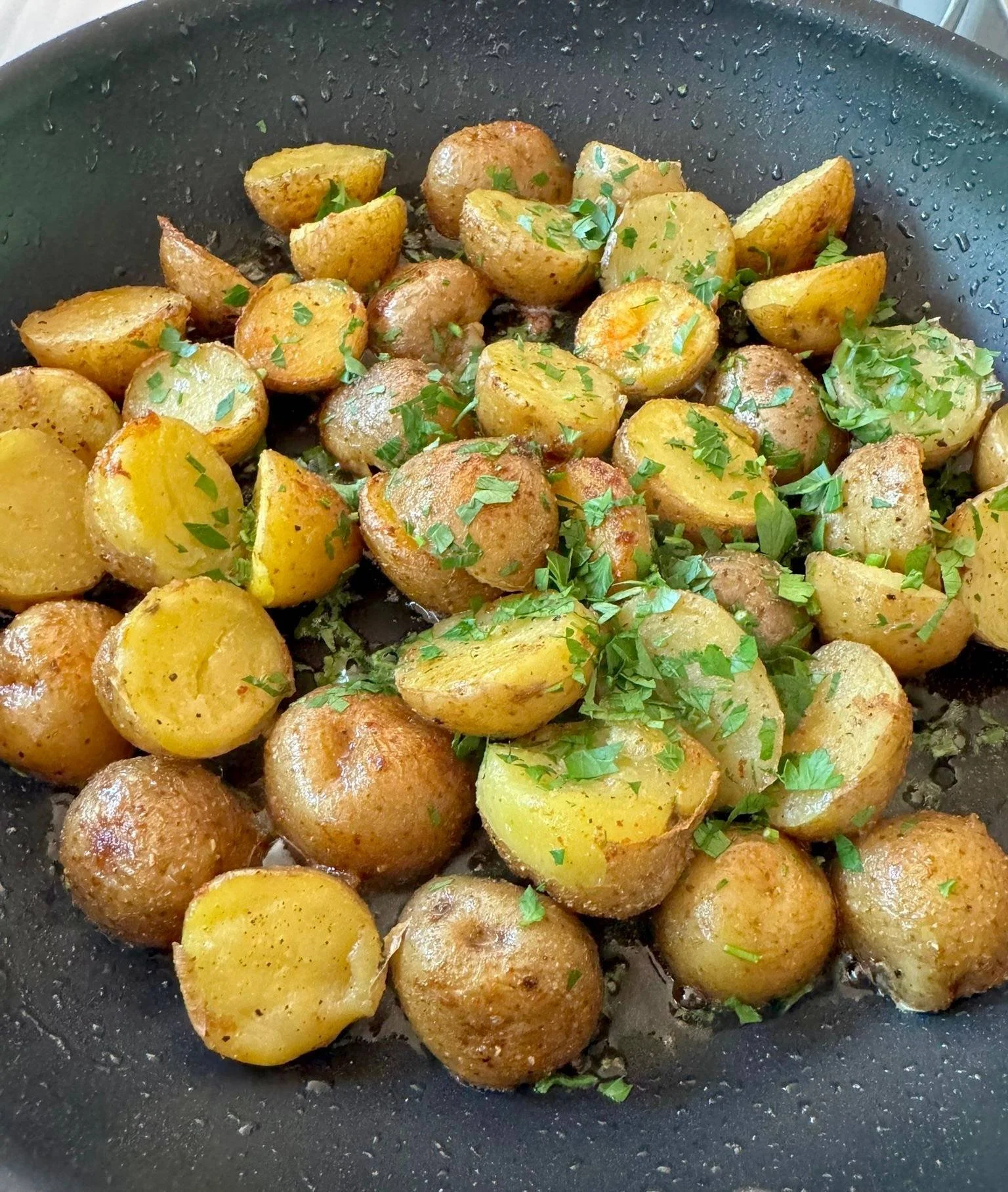 This time of year, when tomatoes, eggplant and squash are in abundance, I like to serve the lamb with ratatouille. If I’m able to find thin-skinned, baby potatoes, I'll buy a bunch at my local farmstand (I'm loyal to Halsey Farm). I then boil them in salted water till ¾ cooked while rendering the trimmed lamb fat in a pan. I gently sauté the par-cooked potatoes in the fat till nicely browned and cripsy.