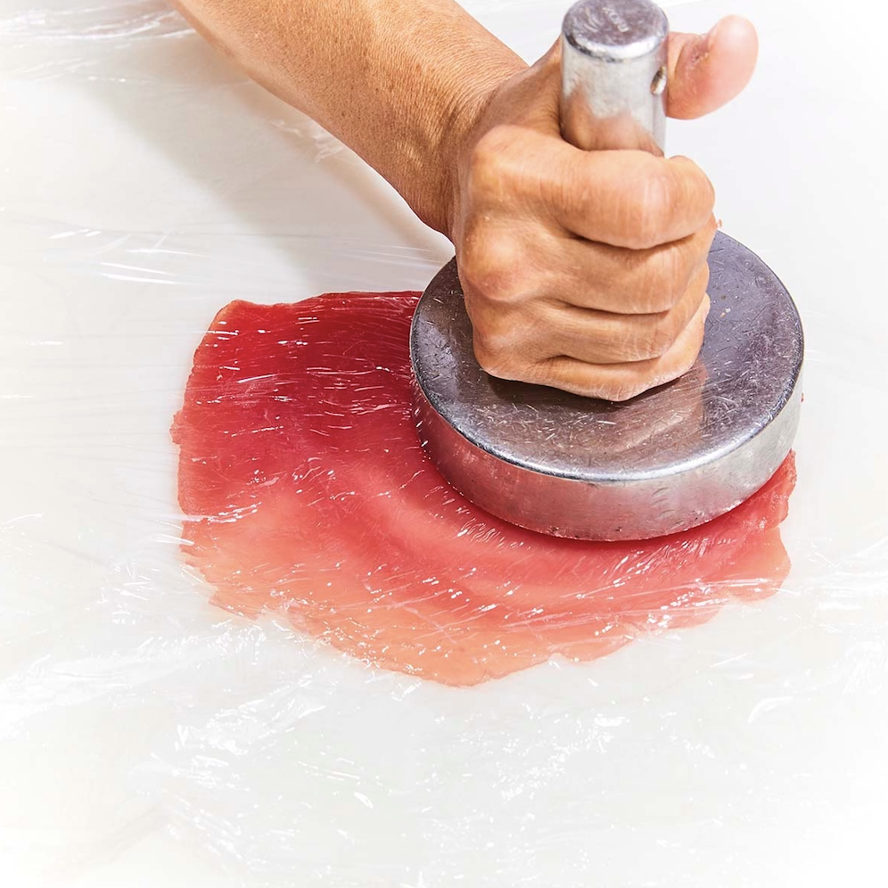 Flatten the tuna with a meat pounder (or a heavy-bottomed saucepan), using a fluid motion that combines hitting the tuna in the center and sliding the surface of the pounder over the fish, pressing it outward. Continue pounding and pressing out the tuna until it forms a very thin, even round, about 9 inches in diameter.