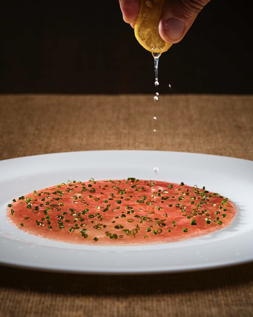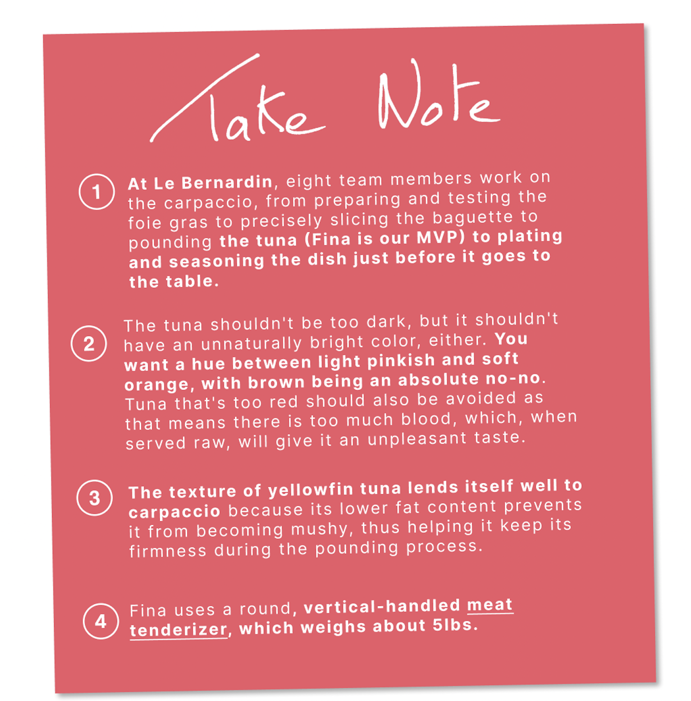 The key to making good tuna carpaccio isn’t complicated—you have to buy good tuna. I prefer yellowfin; bluefin and bigeye are too fatty and can break apart when pounded thin. Then it’s a matter of using a meat tenderizer to pound the tuna to the just-right thickness, about two-tenths of an inch.